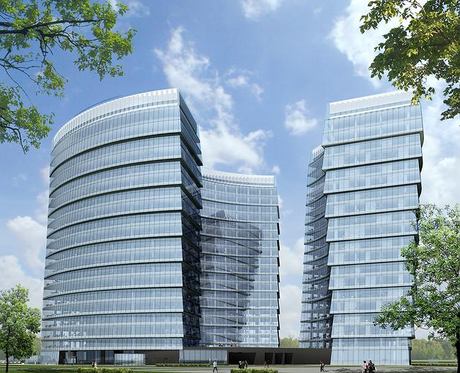 Ансамбль из трех похожих дугообразных корпусов, объединенных общим стилобатом с парковкой, прост только на первый взгляд. На самом деле он наделен сюжетом, завязанным вокруг дерева, посаженного в круглом колодце в самом центре комплекса. Вероятно, из-за появления живого древесного стержня здания тоже понемногу начинают оживать и «шевелиться». Образно говоря.